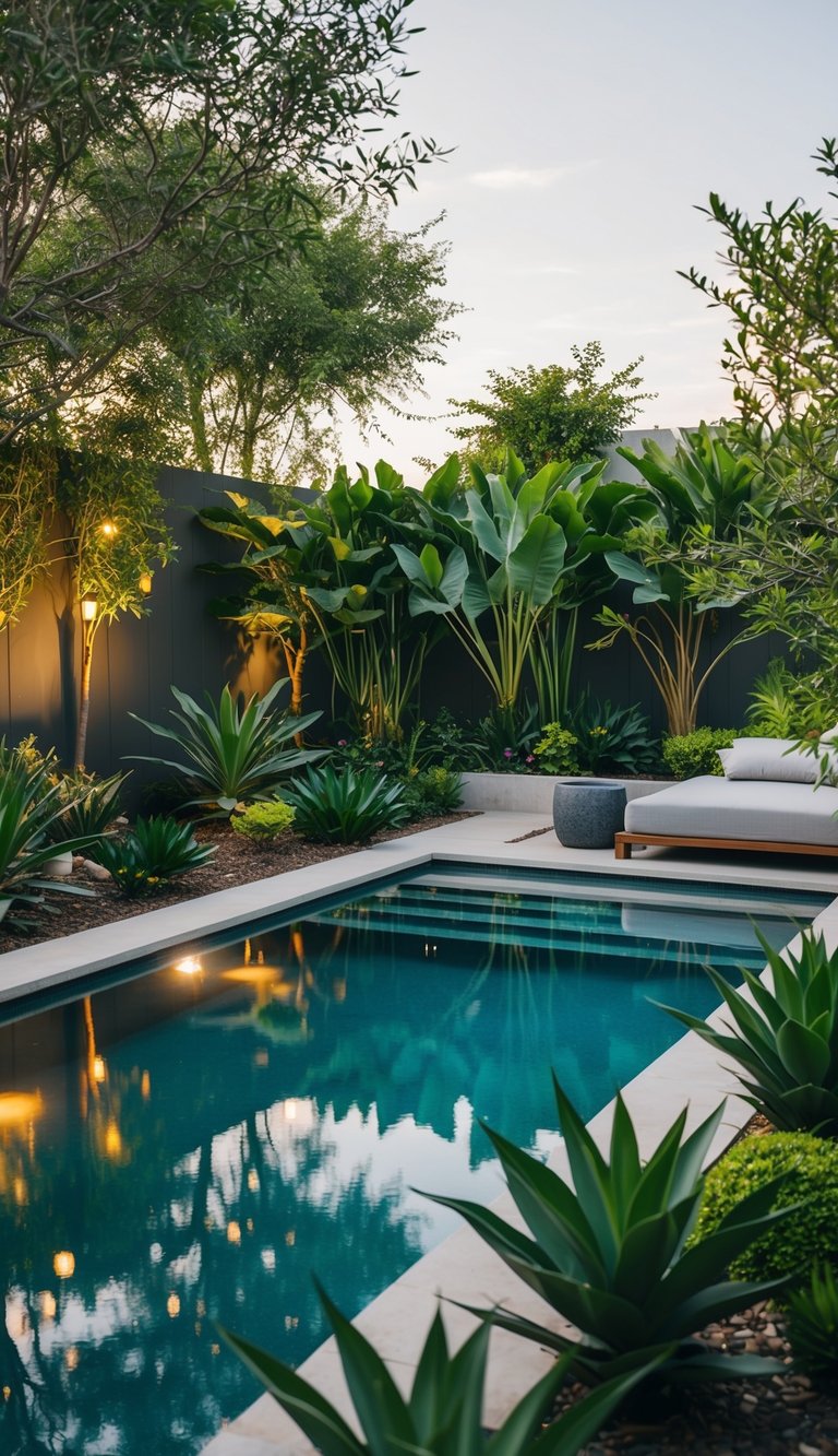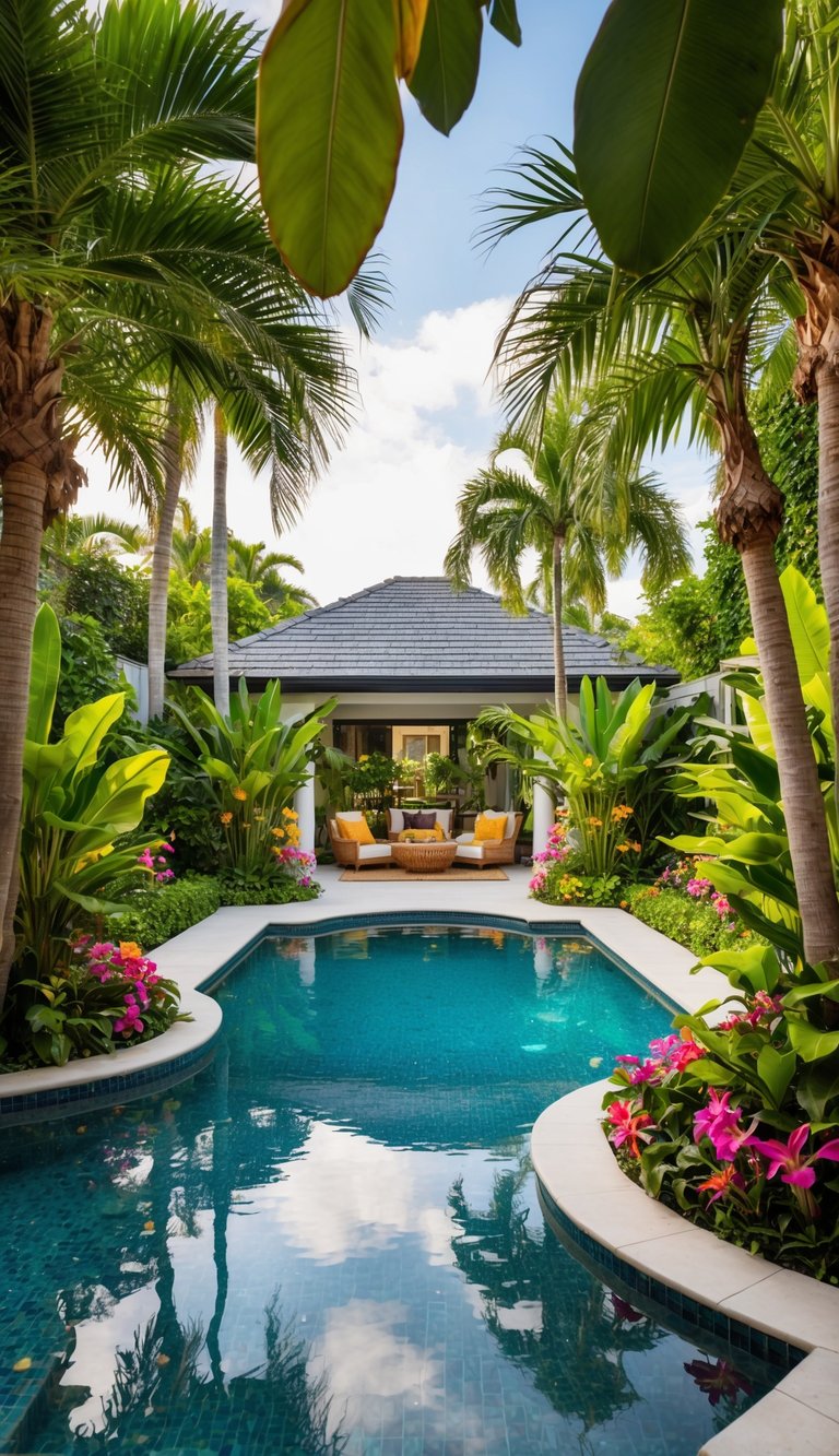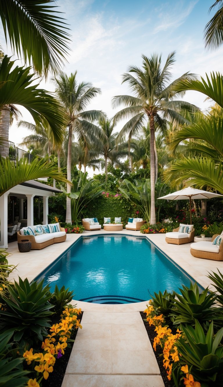Water features, such as a small waterfall, can enhance the tropical experience. You might also consider using natural stones for a rustic touch around the pool’s edge.