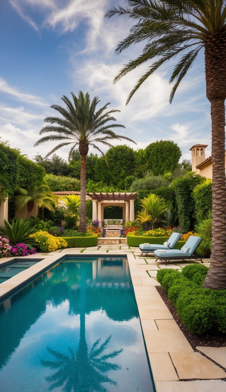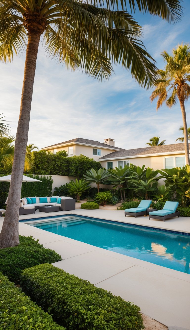 Transform your backyard into a tropical paradise to instantly upgrade your pool area. Begin with an abundance of lush greenery, like palm trees and ferns, to establish a vibrant, jungle-like atmosphere.