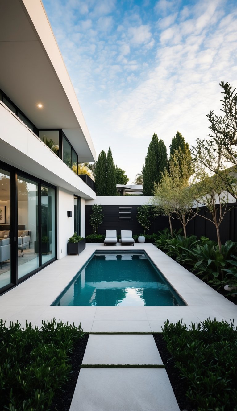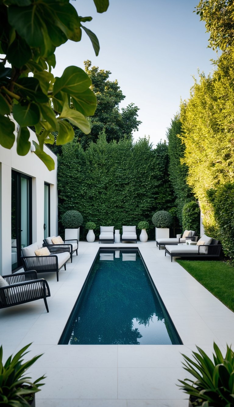Incorporate sleek lounge chairs and other stylish outdoor furniture to create zones for relaxation. A few well-placed lights can also add to the modern ambiance at night.