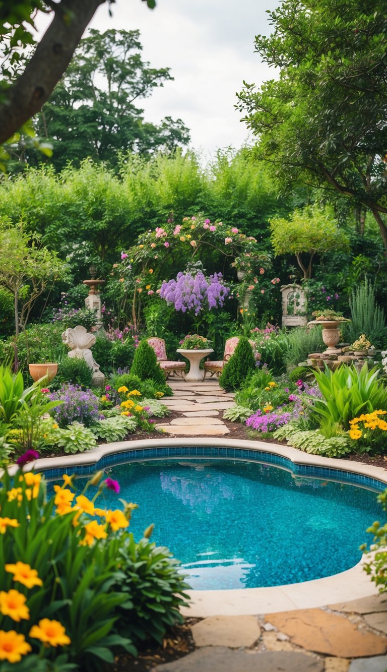 Incorporate ferns and wildflowers to introduce bursts of color around the pool. These plants thrive in areas with partial shade, which enhances the tranquil and secluded setting.