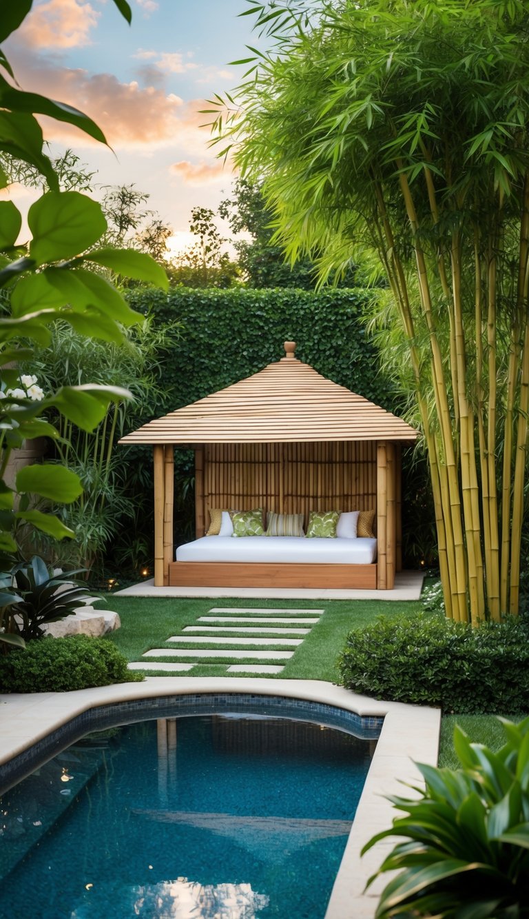 Consider adding a hammock or comfortable lounge chairs nestled among the bamboo stalks. This creates the perfect spot for unwinding after a refreshing swim. Pots of colorful flowers can add vibrancy to the green, leafy backdrop.