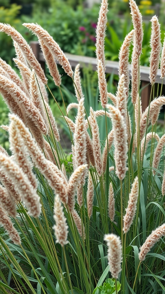 A dynamic mix of colors and textures is what makes a cottage garden thrive. Lush grasses provide a beautiful contrast to the bright flowers that are typically the stars of these gardens. The photo shows tall, feathery grass plumes swaying in the breeze. Their soft, fluffy tops bring a sense of warmth and movement to the area.
