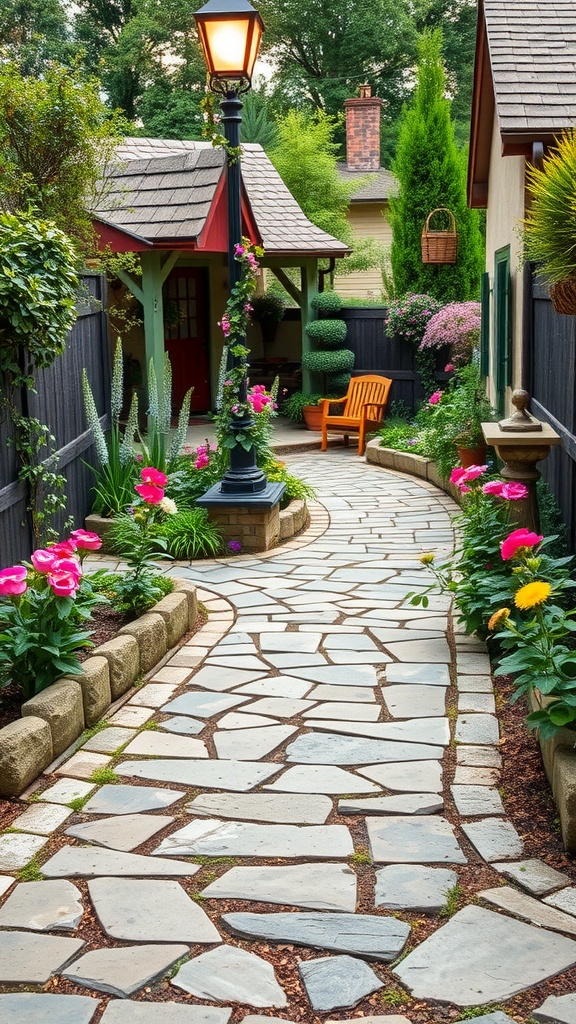 A rustic pathway made from natural stone is an incredible way to infuse your cottage garden with timeless charm. This garden features a beautiful stone path that winds through vibrant greenery and flowers, practically begging you to take a leisurely stroll. Using irregular stones gives the walkway an organic, natural appearance.