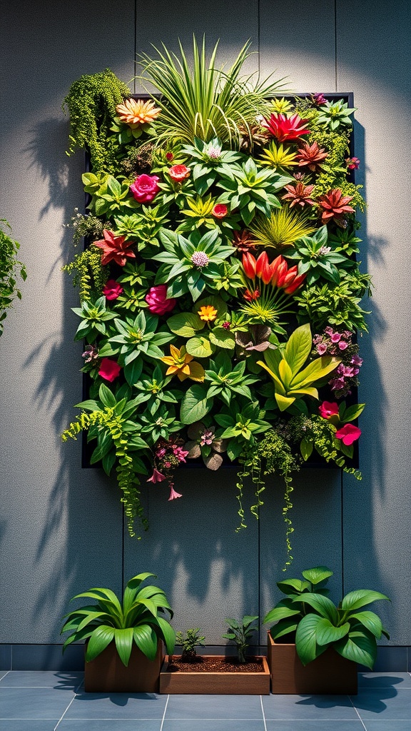 Vertical gardens present a brilliant solution for anyone looking to make the most of their available gardening area. This image shows a lively wall of plants that breathes life into its surroundings. With its rich variety of colors and textures, it turns a simple wall into a thriving, lush garden.