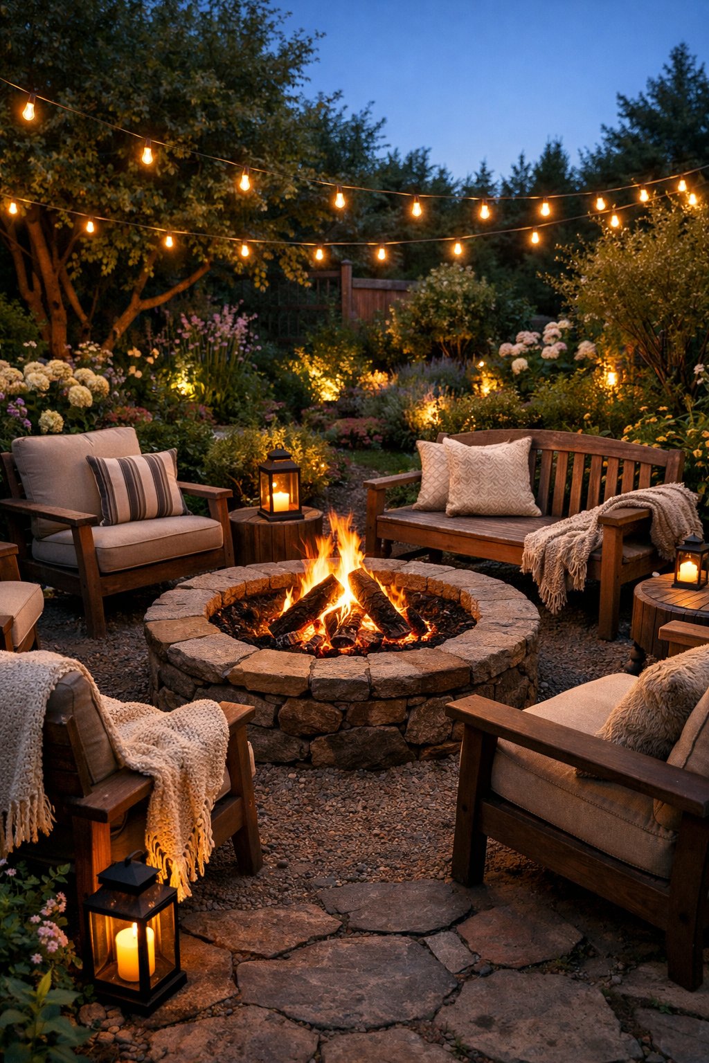 Place a safe fire pit at the center of a ring of chairs or benches to encourage conversation. Opt for comfortable seating, whether it’s benches, low chairs, or even stone seating with plush cushions.
