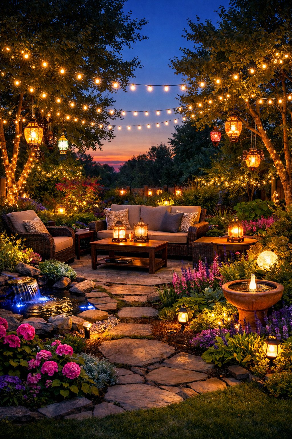 Use warm bulbs for seating zones and cooler tones to highlight plants or water features. Drape fairy lights through trees or along fences for an instant touch of charm.