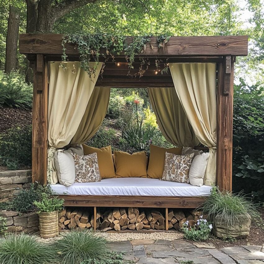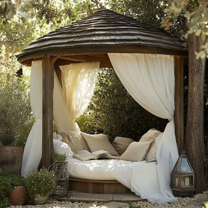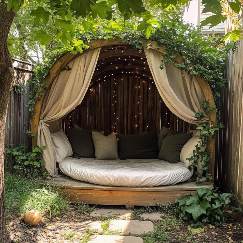 For a whimsical and breezy feel, you can build a nook using only curtains. Hang lightweight, weather resistant fabrics from a simple frame or overhead structure to define your reading space. The curtains offer wonderful versatility. You can pull them back to enjoy the garden view or close them for a bit of privacy and shade, making this a stylish and budget friendly choice.