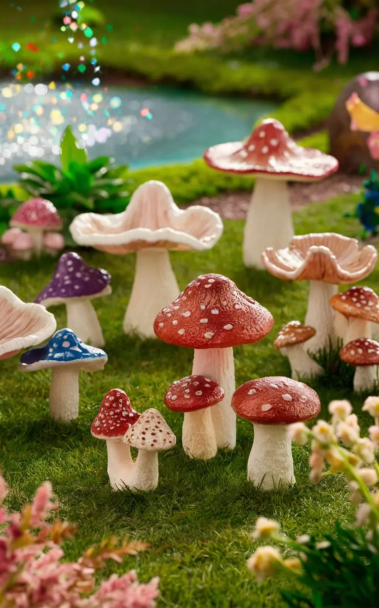 You can find mushroom stools made from materials like clay, resin, or wood. They are often available in bright hues, making your garden scene truly pop. Arranging them throughout your fairy garden cultivates a fun and welcoming vibe.