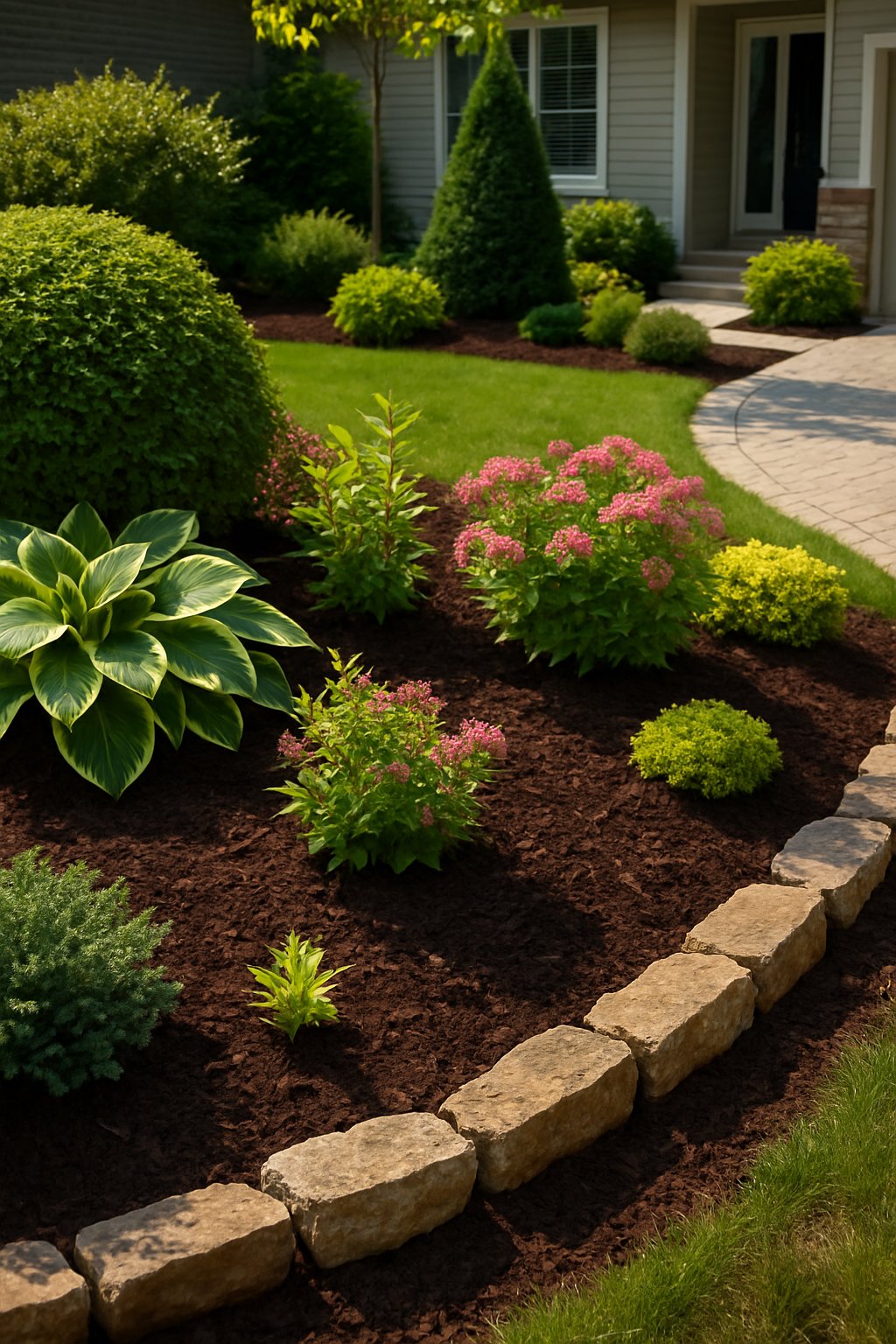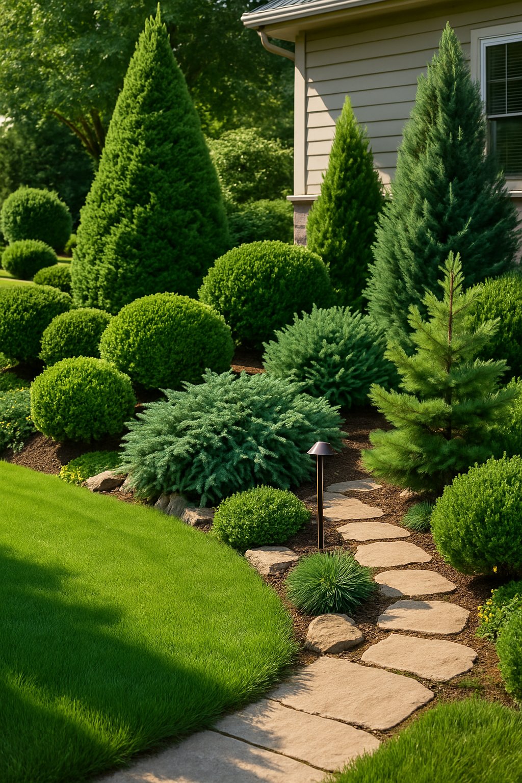 For a more textured and dynamic appearance, mix different sizes and shapes. Evergreens can serve as natural privacy screens or be used to neatly edge your yard.