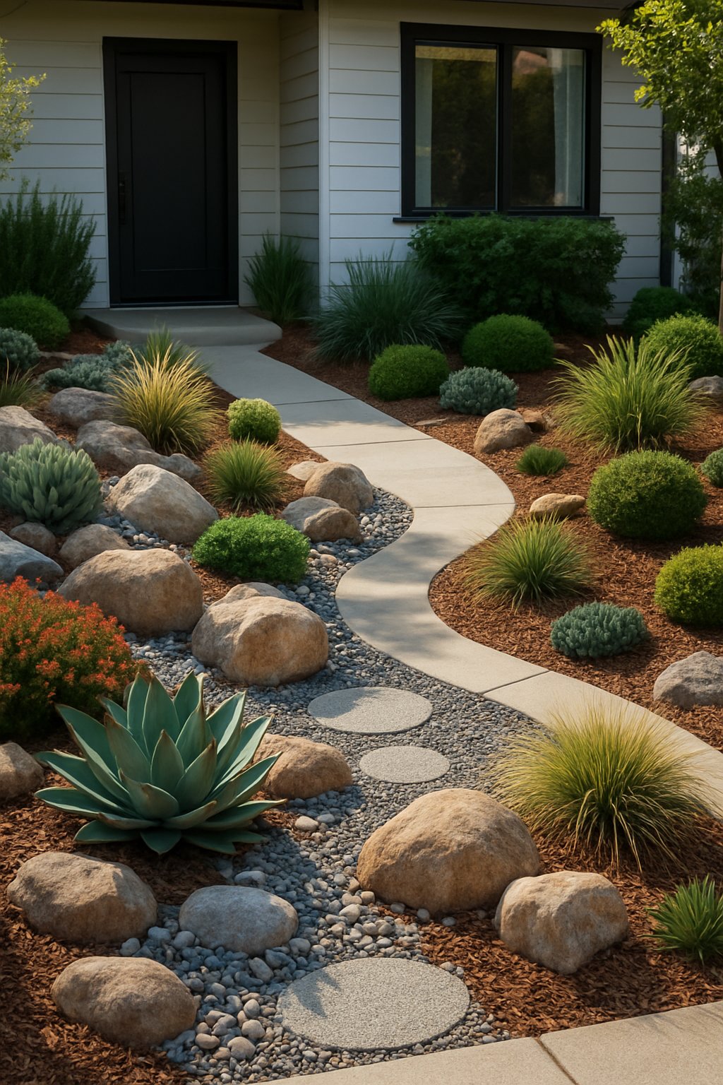 Incorporate drought-tolerant plants, such as succulents or small shrubs, around the rocks. This adds greenery while keeping the maintenance level low.