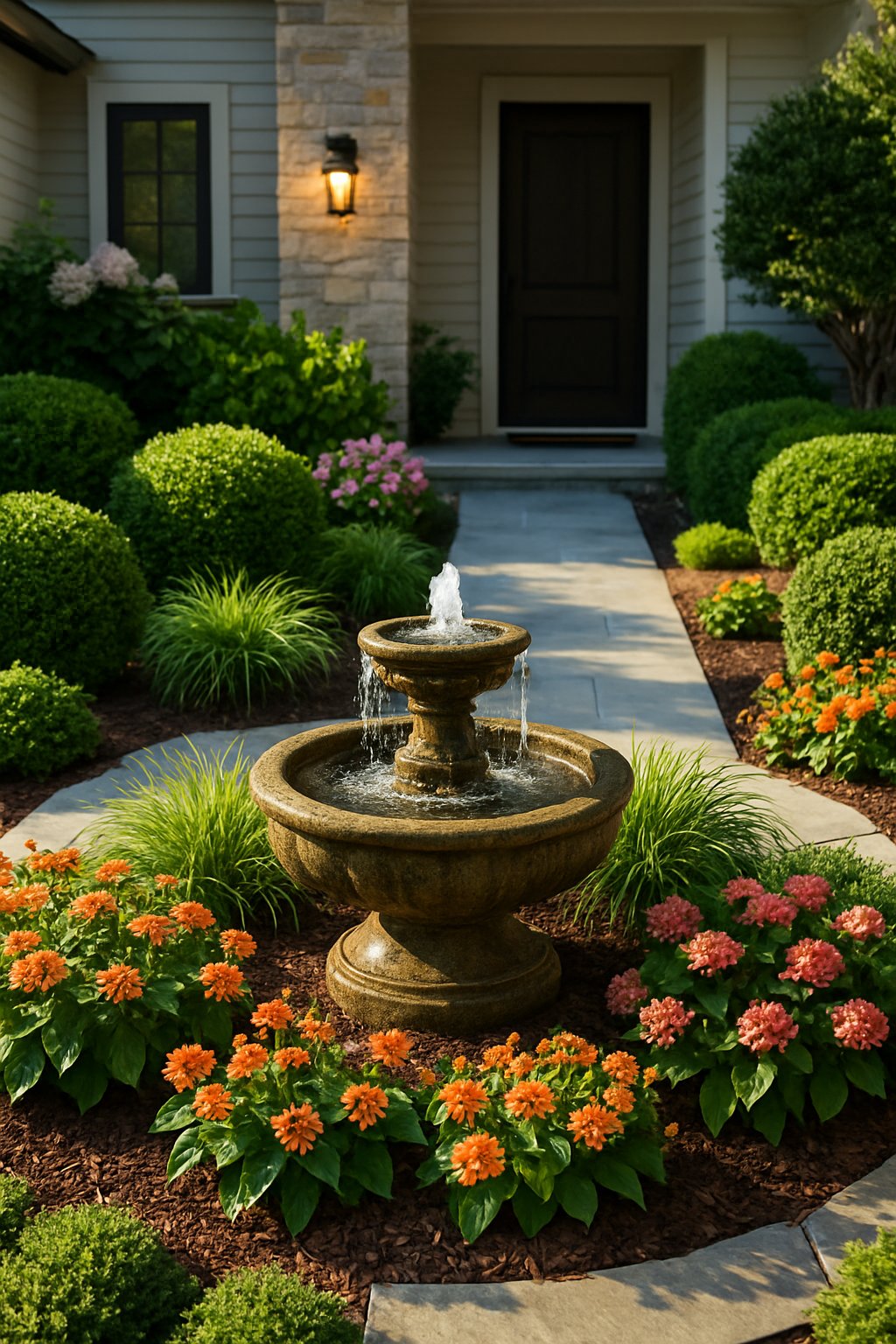 A small water fountain can introduce a sense of peace and style to your front yard, even if you’re working with limited space. Select a design made of stone or wood that complements your home’s aesthetic.