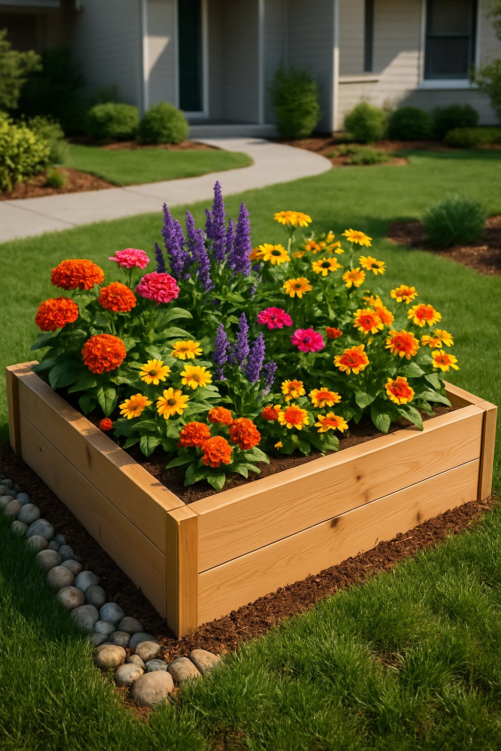 Constructing a raised garden bed is a simple way to introduce vibrant color to your front yard. You can swap out the flowers each season to maintain a fresh and updated look.