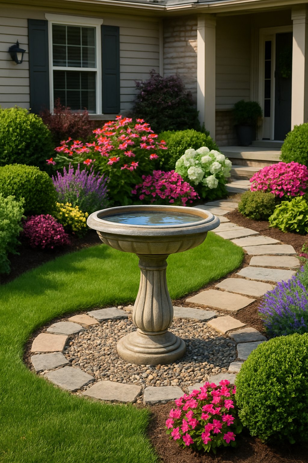 A birdbath can instantly add beauty and vitality to your front yard. It serves as a natural attraction for birds, making your garden feel more alive and connected to the surrounding nature.