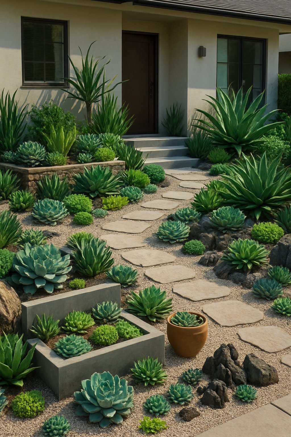 Succulents are a fantastic addition to front yards because they require very little water. Planting them in groups allows you to create interesting shapes and textures.