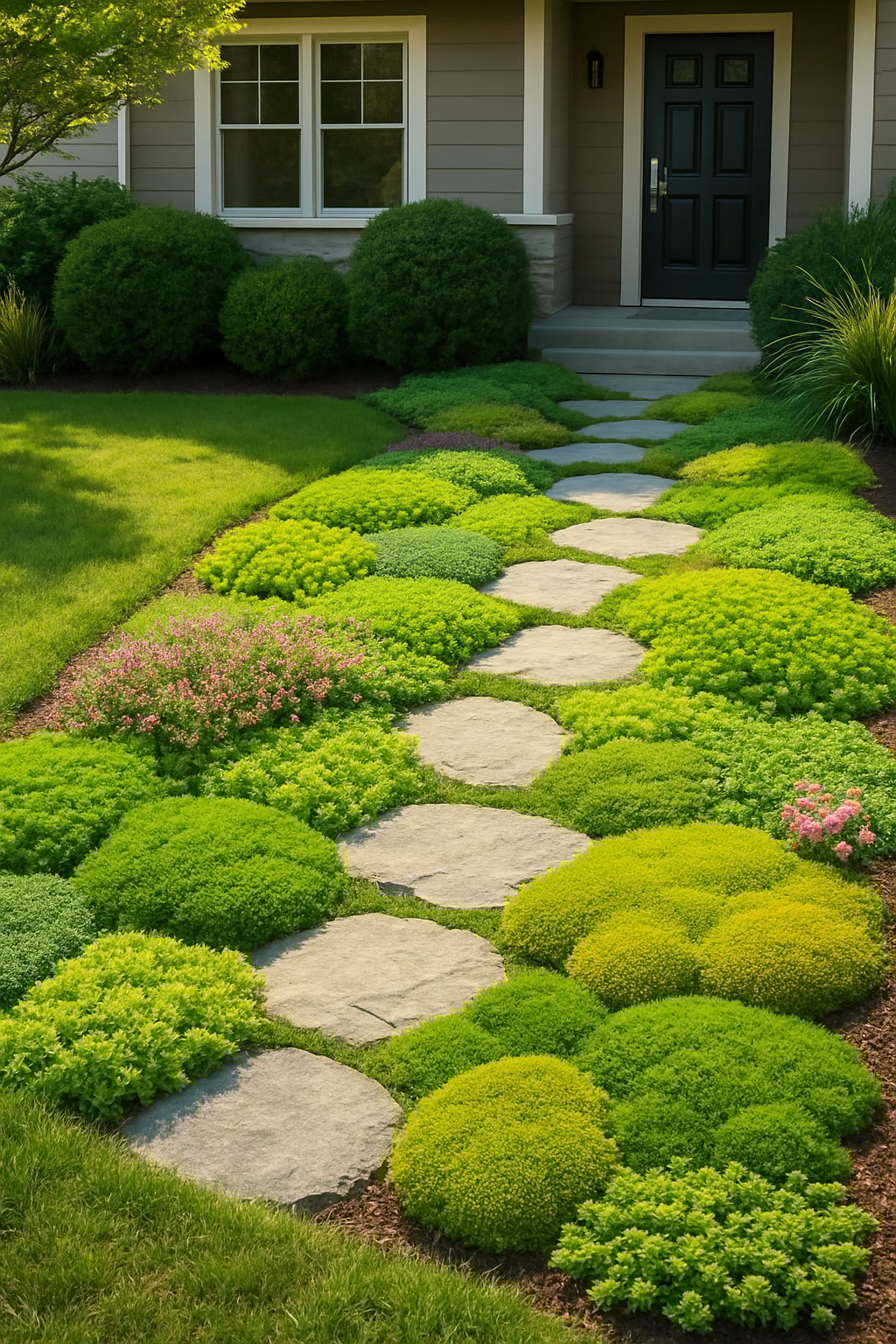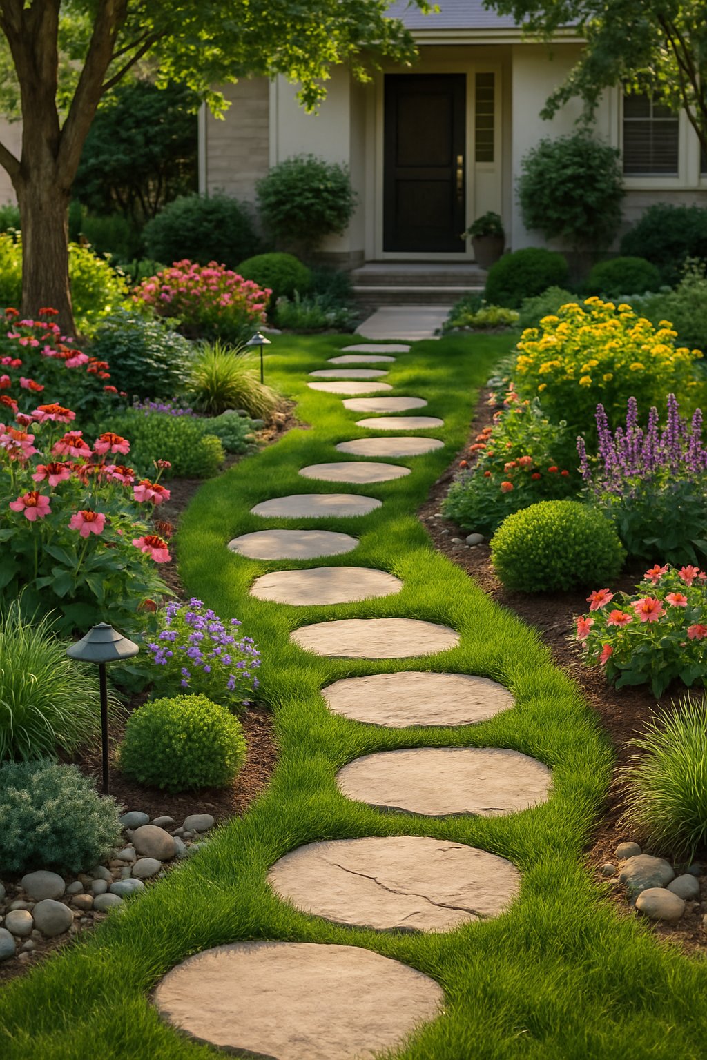 Feel free to mix materials; concrete, natural stone, or even painted rocks can all be effective. Space the stones out enough to allow grass or ground cover to grow between them, which creates a softer, more natural look.