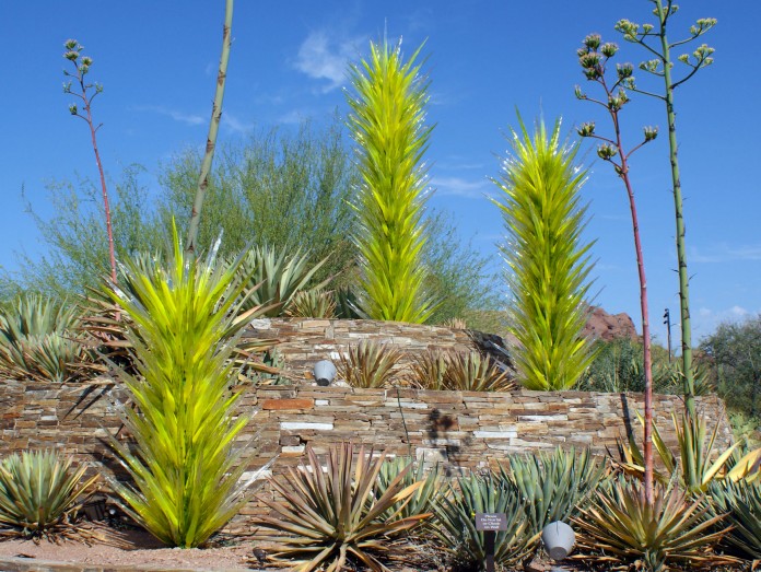 When discussing glass art for the garden, it is impossible not to include a Chihuly piece. These spectacular art glass cacti are so lifelike that people often mistake them for real plants. Source