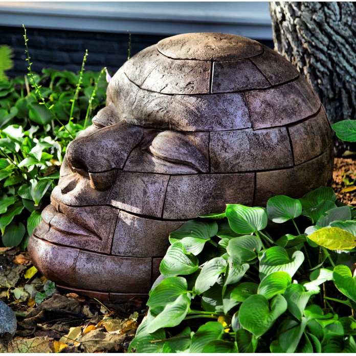 Blocks of stone are arranged to create a striking head sculpture in the garden. Source