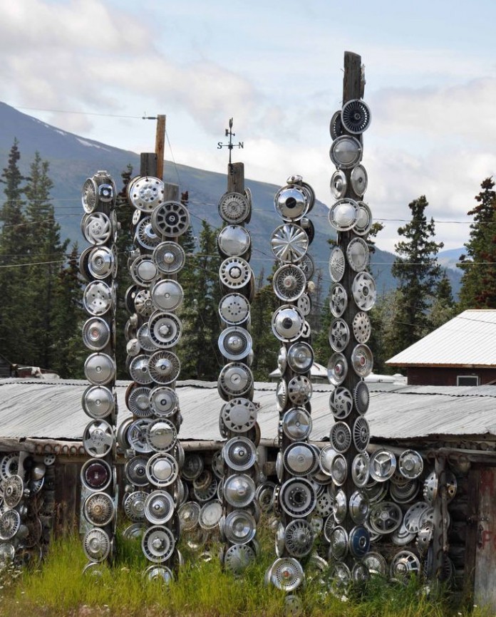 This is a totem sculpture created from hub caps. Source