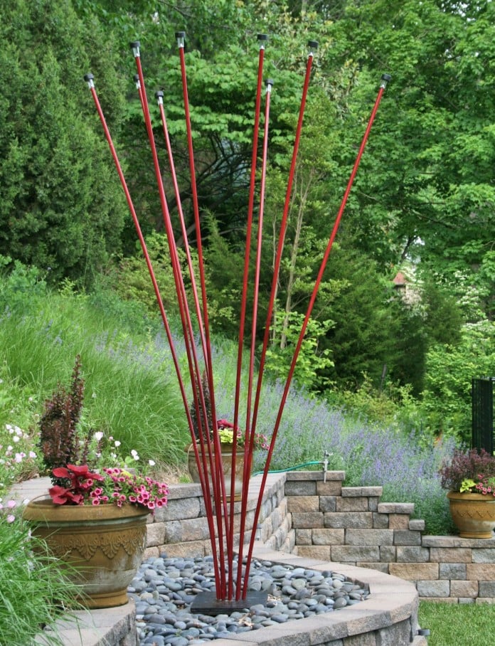 These garden art sculptures are made from steel or aluminum tubes painted with durable outdoor paint. Source