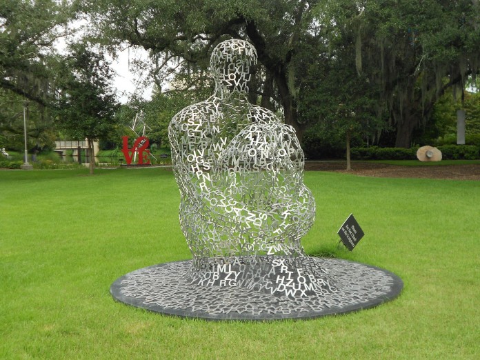 Metal words offer a message in the New Orleans sculpture garden. Source