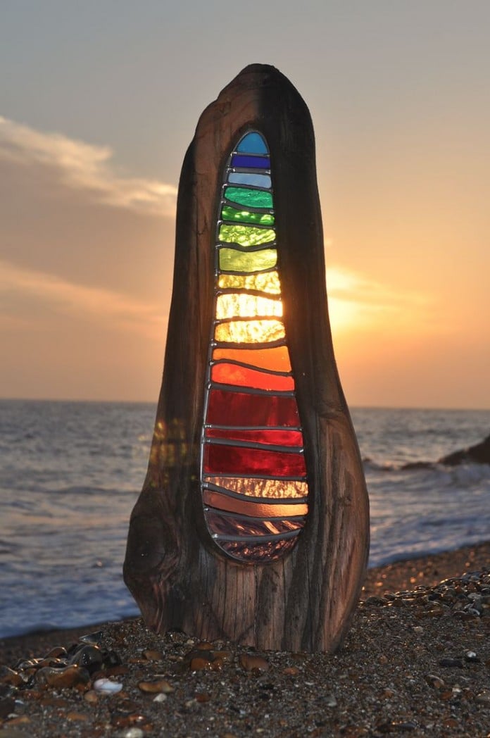 Louise Durham creates beautiful work, crafting stained glass sculptures that incorporate found wood. Source