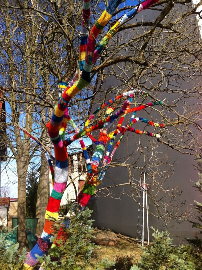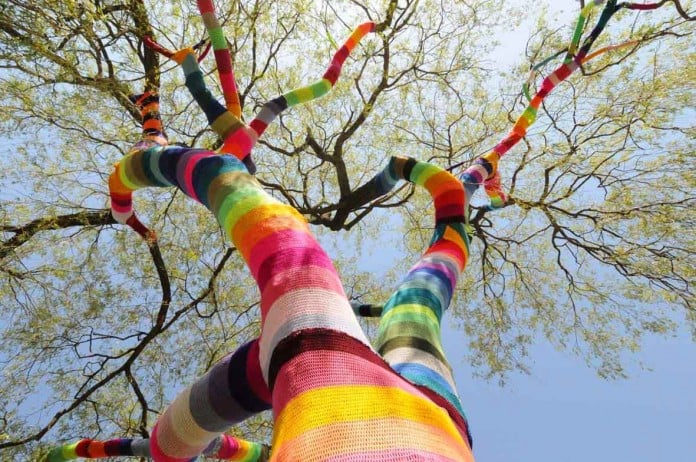 The new trend of outdoor knitting brightens up trees, turning them into colorful garden sculptures. The fantastic primary colors are a bonus, and who knows, perhaps trees do get cold in the winter. Source