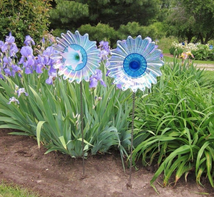 Glass flowers crafted from old plates, cups, and saucers make for excellent DIY flower sculptures. Source