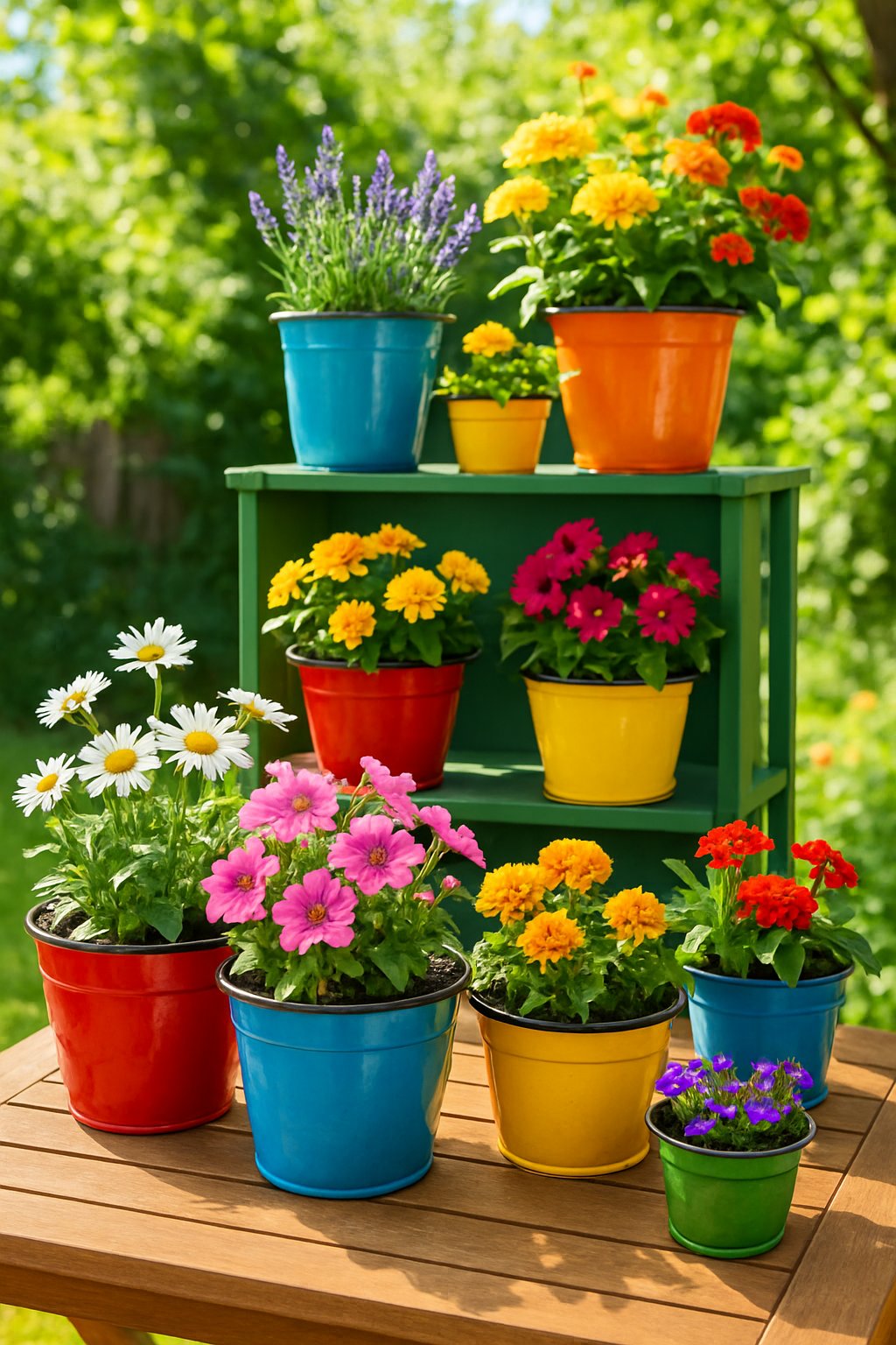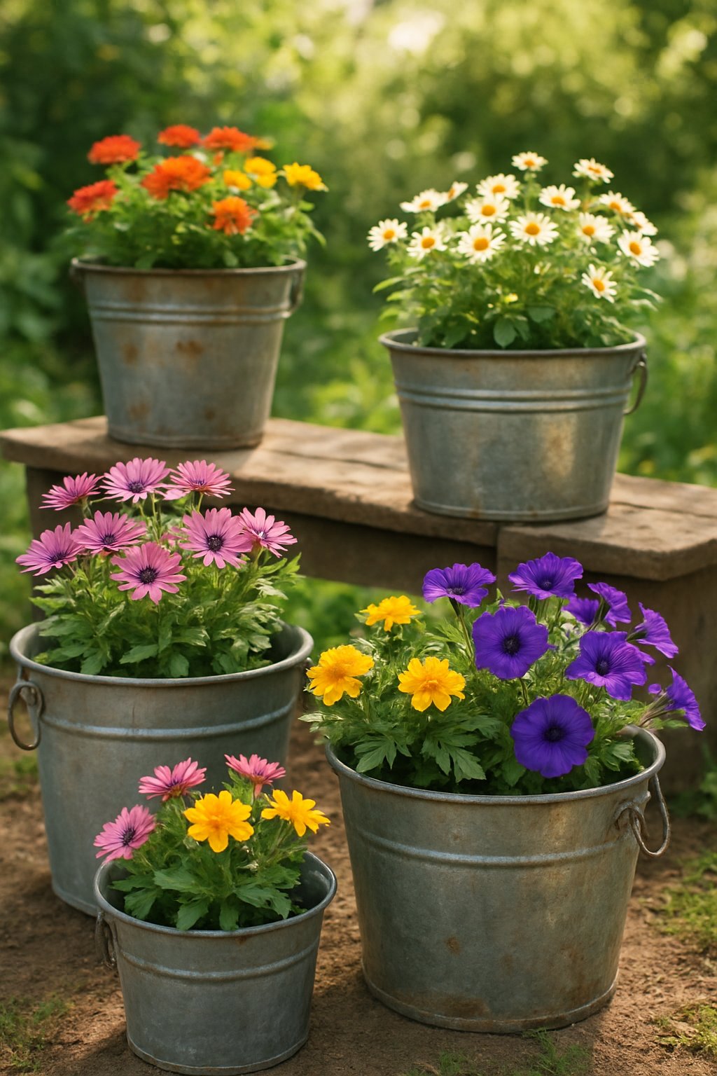 Repurposing old metal buckets is a simple way to introduce a rustic feel to your garden. These are perfect for planting smaller flowers or herbs. It’s crucial to drill drainage holes in the bottom to prevent water from collecting and harming the roots.
