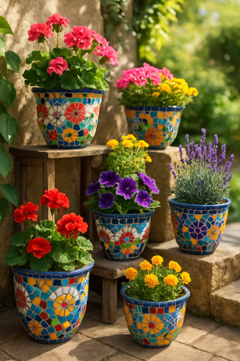 Brighten up your outdoor area with vibrant mosaic tile pots. These containers capture attention with intricate patterns made from small pieces of glass or ceramic. They serve as a stunning backdrop for simple green plants or dazzling flowers.