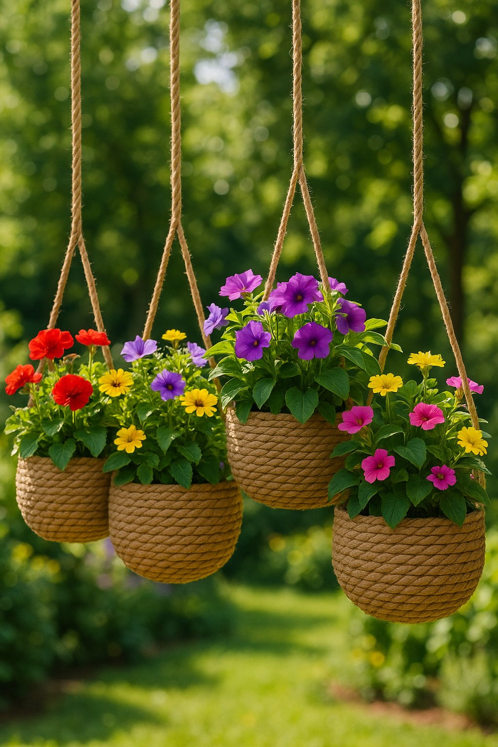 Hanging rope basket planters introduce a natural, rustic charm to your outdoor decor. They are an excellent way to save ground space and look lovely on porches or patios. You can fill them with vibrant flowers or graceful trailing plants for a soft, verdant display.