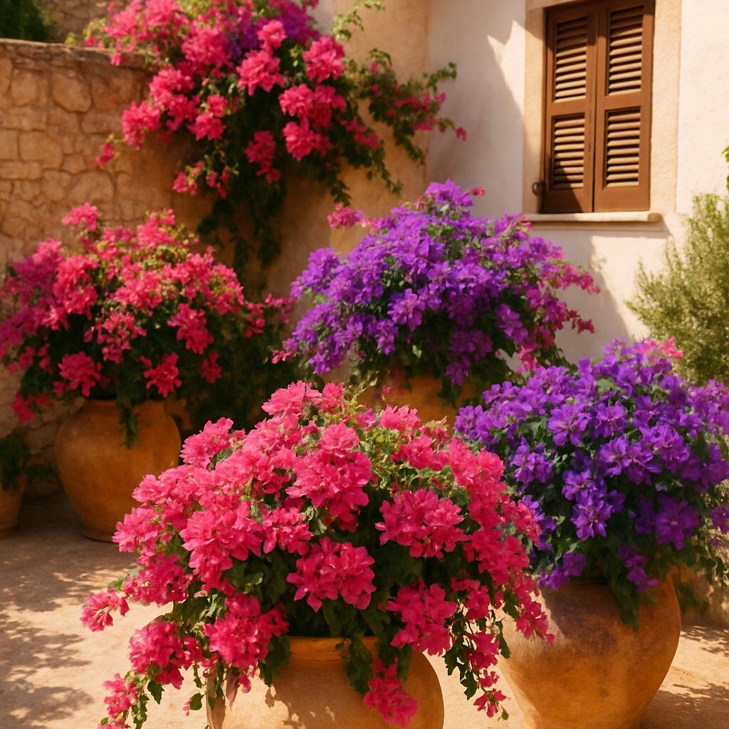 Bougainvillea is a sun-lover that thrives in drier conditions. Let the vibrant vines spill over the edges of the pots for a lush, untamed appearance, creating a mini-paradise with minimal effort.