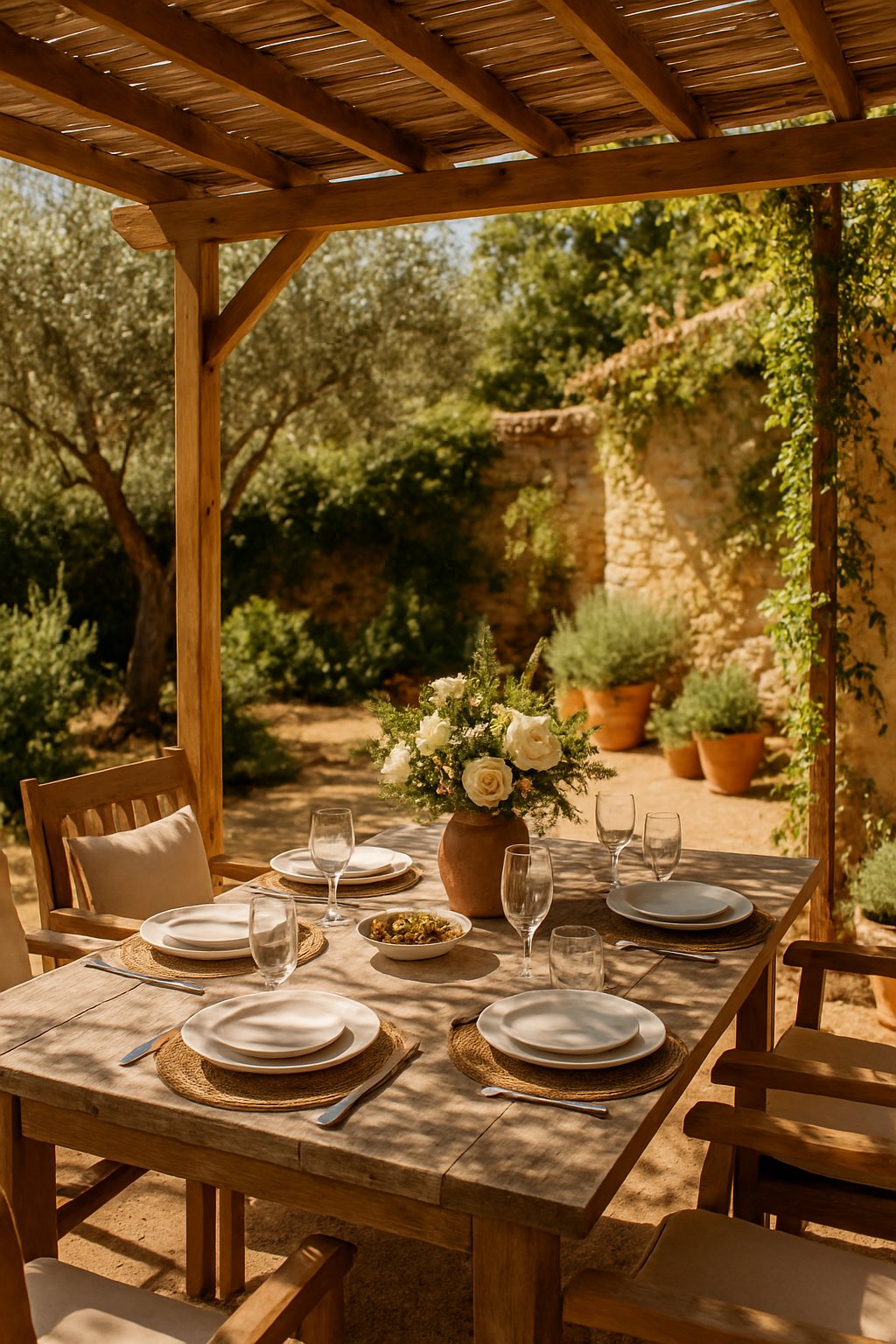 This setup is perfect for long, leisurely dinners with loved ones or quiet mornings with your coffee. Opt for wooden beams to achieve a warm, natural aesthetic that complements the Mediterranean feel.