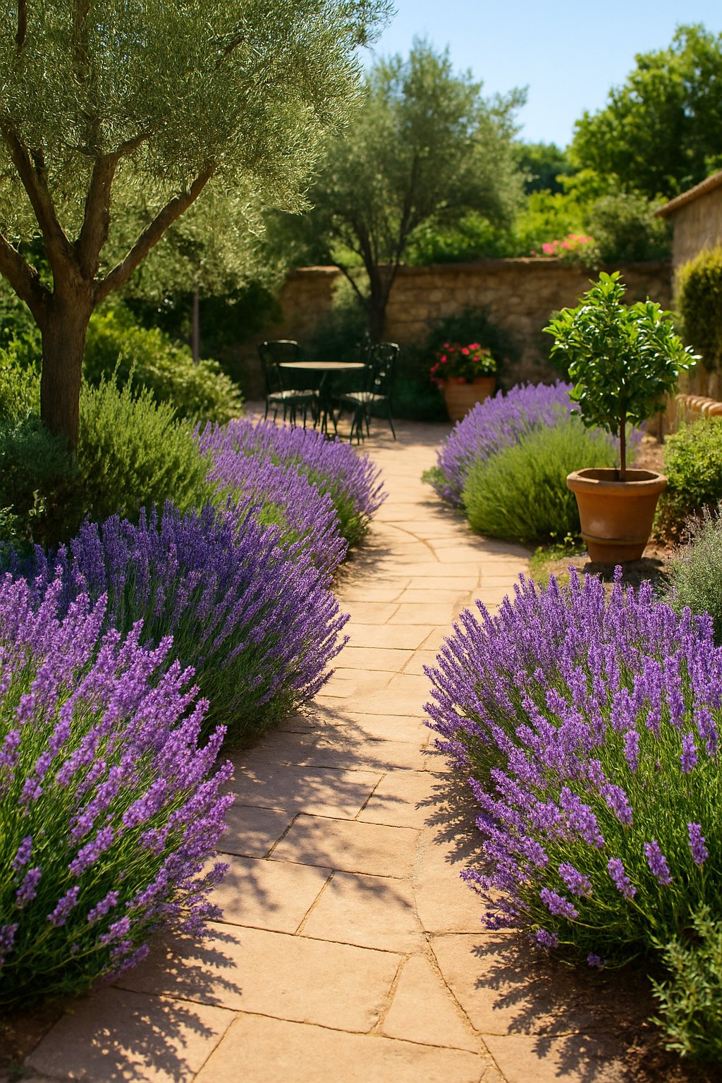A pathway bordered by soft purple lavender creates a truly peaceful experience. The sweet, calming fragrance transforms your garden into a serene Mediterranean retreat.