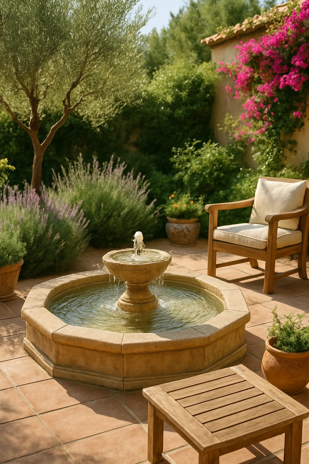 Select a fountain that matches your style, perhaps one made of stone or terracotta that produces a soft bubbling sound. The volume of water and its flow will determine the level of sound it generates.