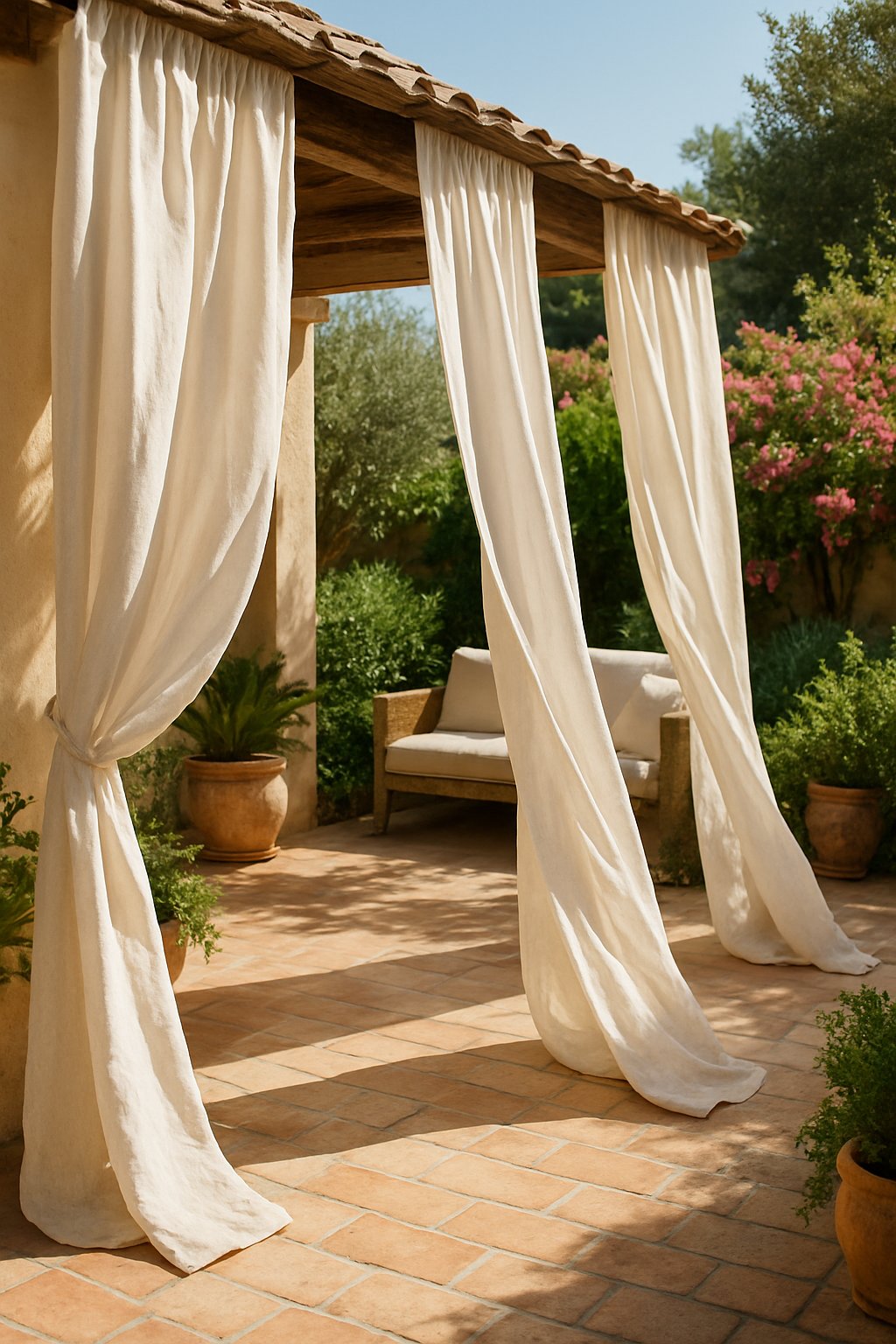 To give your backyard the feel of a relaxed Mediterranean getaway, consider hanging linen curtains around your patio. Linen is light and airy, allowing fresh air to circulate while offering a sense of privacy.