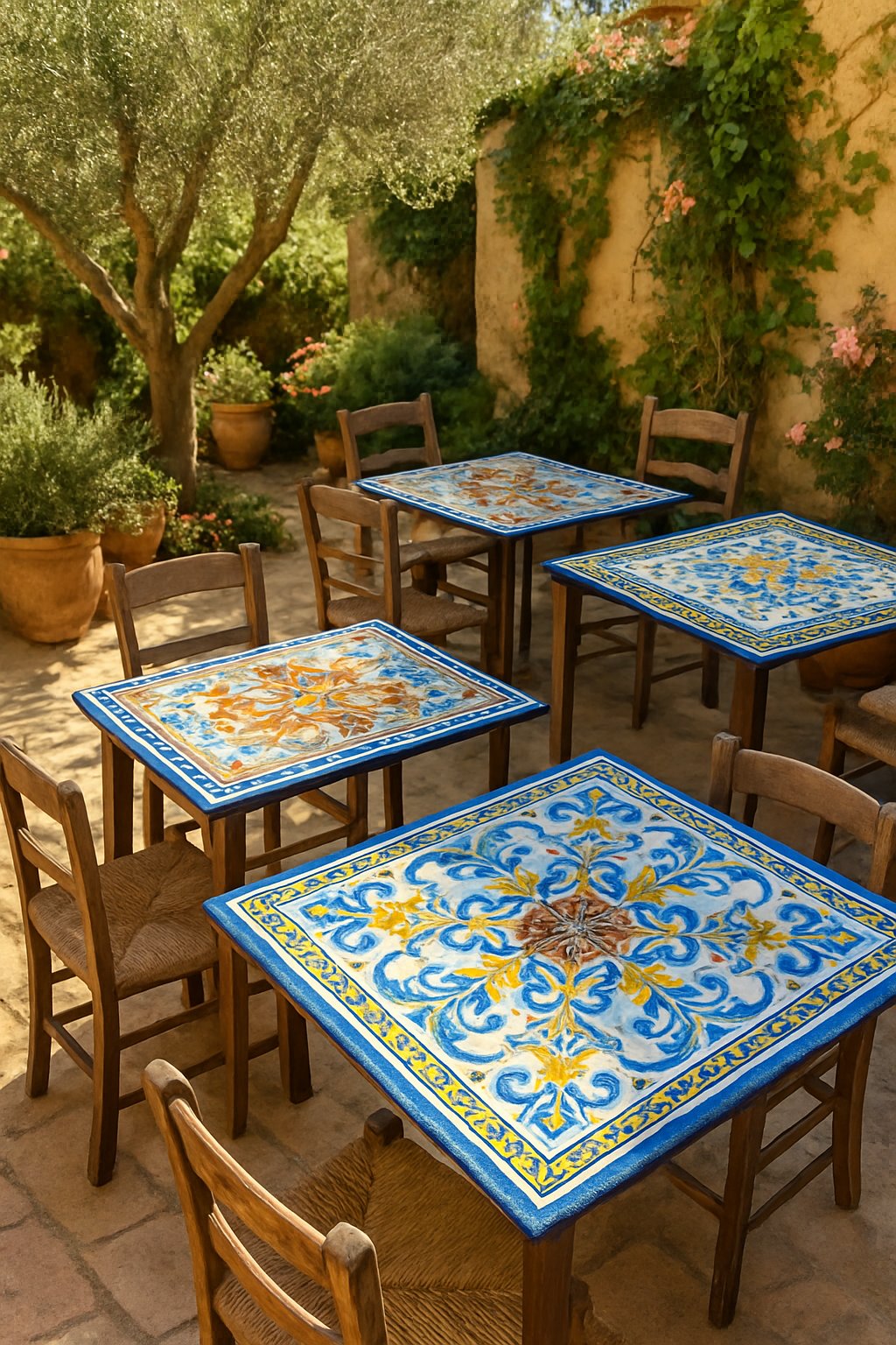 For an authentic Mediterranean feel in your backyard, hand-painted tile tabletops are a fantastic addition. These tables introduce vibrant colors and bold patterns that are both genuine and timeless.