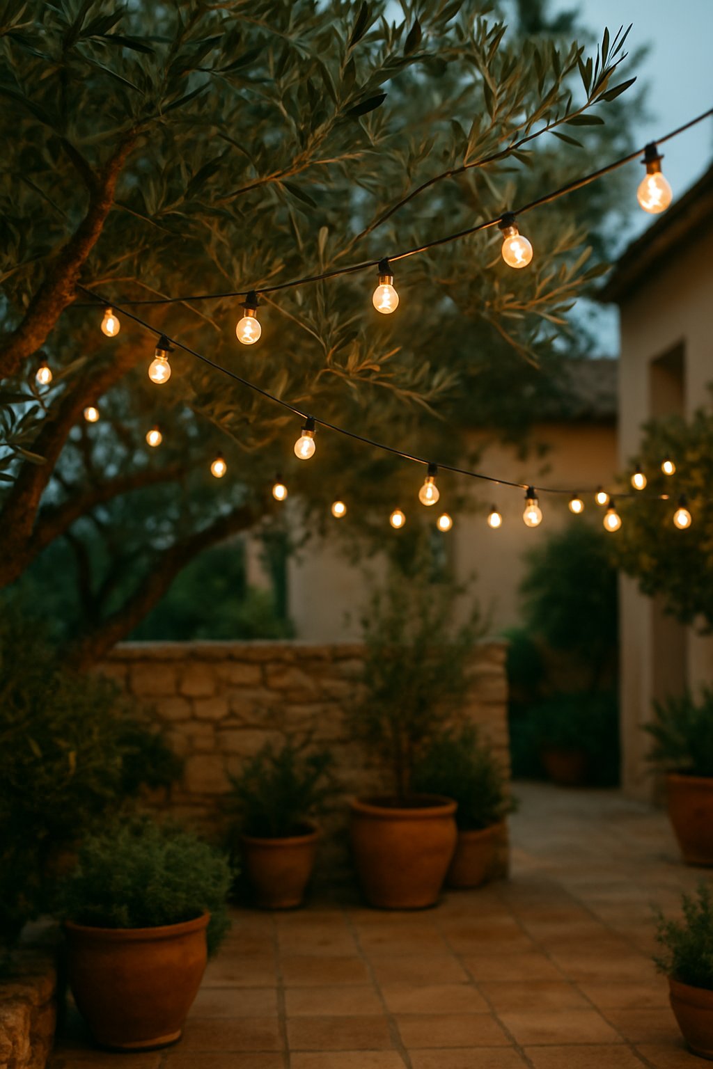 Weaving fairy lights through the branches of an olive tree will cast a soft, warm glow over your backyard. This simple touch adds a real sense of magic, especially after sunset. The gnarled olive branches provide ideal anchors for tiny lights that will twinkle like stars.