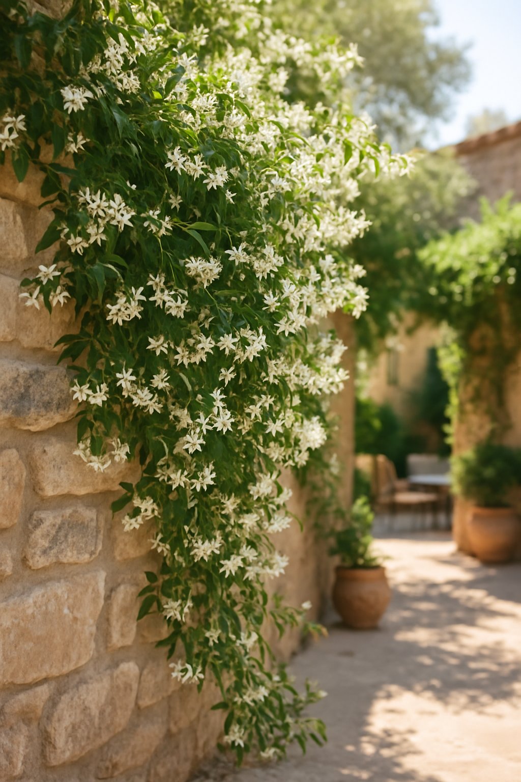 Planting climbing jasmine along your stone walls will add both charm and a wonderful fragrance to your backyard. Jasmine thrives on rough surfaces, making stone walls a perfect backdrop to showcase its lush green leaves and delicate white flowers.