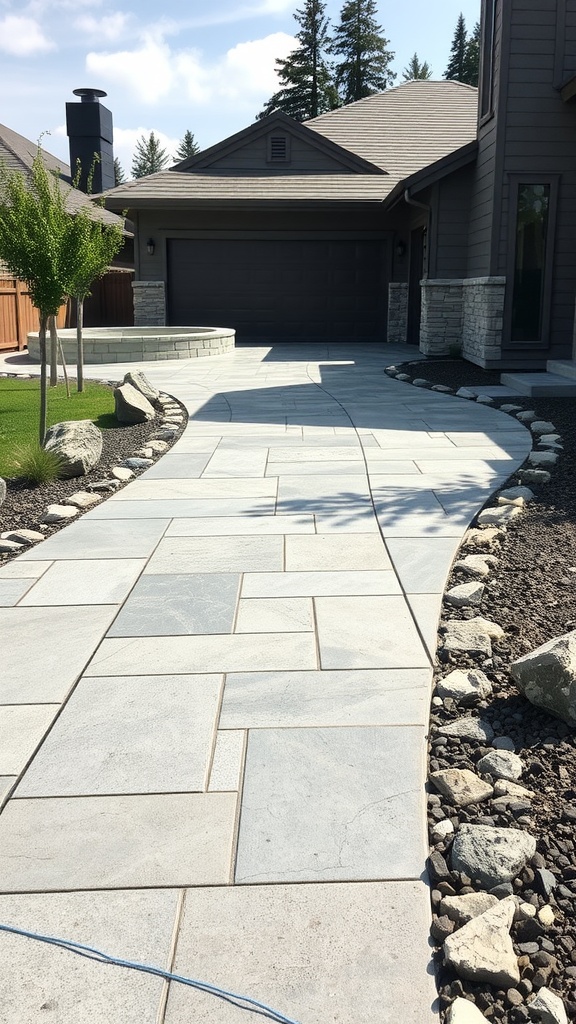 When you think about modern driveways, sustainability is a huge part of the conversation. This image highlights a gorgeous, eco-friendly path made from natural stones. These stones are not only attractive but also practical, as they allow water to seep through. This helps reduce runoff and supports groundwater recharge. The surrounding greenery adds a lovely touch, blending the natural world with a modern look.