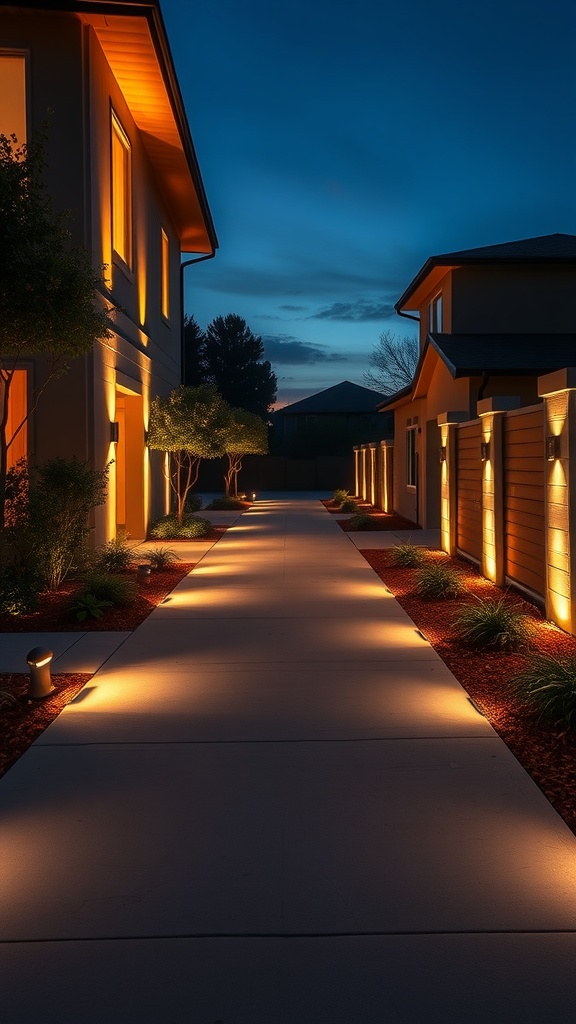 Adding integrated lighting can completely change the look of a modern driveway. Just look at this beautifully lit path, a perfect example of how lighting can elevate an ordinary space into something truly special. The warm glow creates a welcoming atmosphere, guiding visitors safely. By placing lights thoughtfully along the driveway, you can highlight your home’s architecture while improving safety.