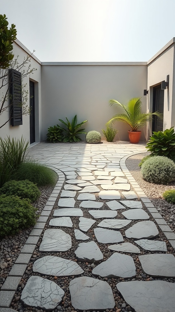 Minimalist Zen driveways offer a serene and clean aesthetic that complements any modern home. The image features a stylish, paved walkway that is both practical and visually appealing. The large, flat stones create a smooth path, while the simple layout promotes a calm atmosphere. Small plants and decorative rocks surround the driveway, enhancing the natural vibe.