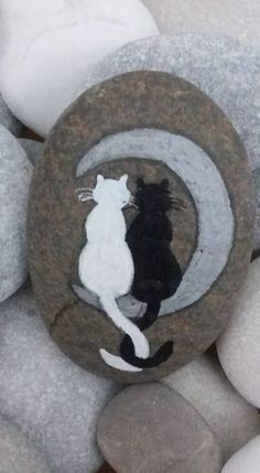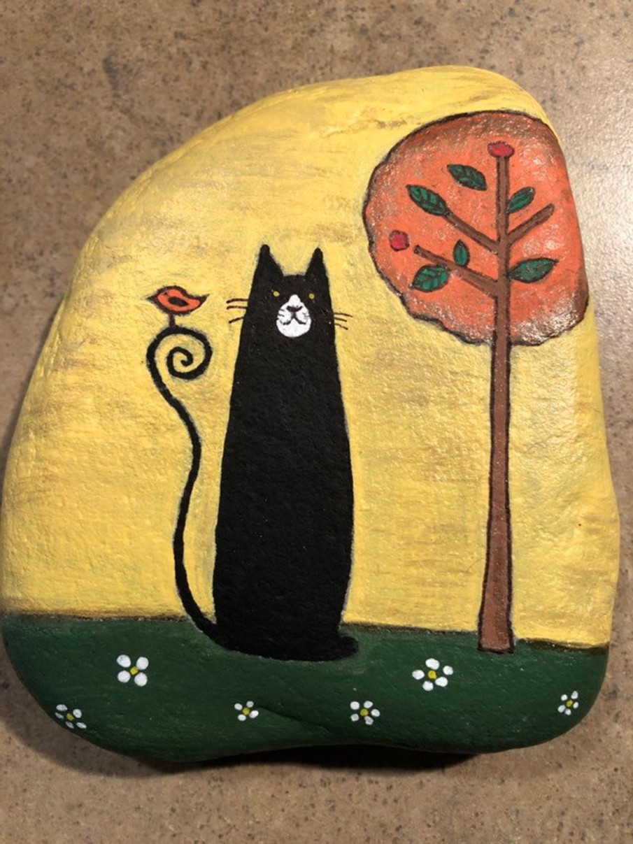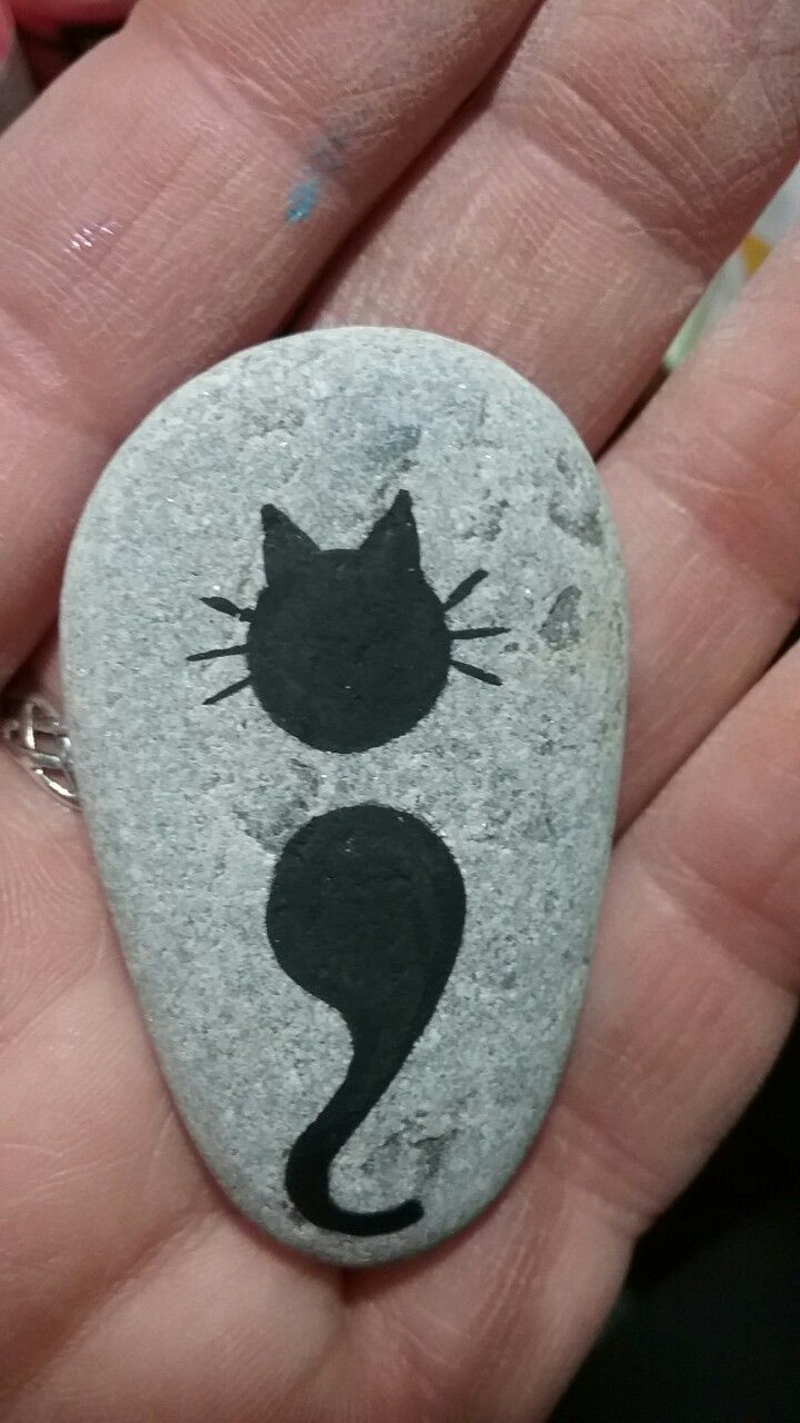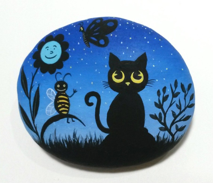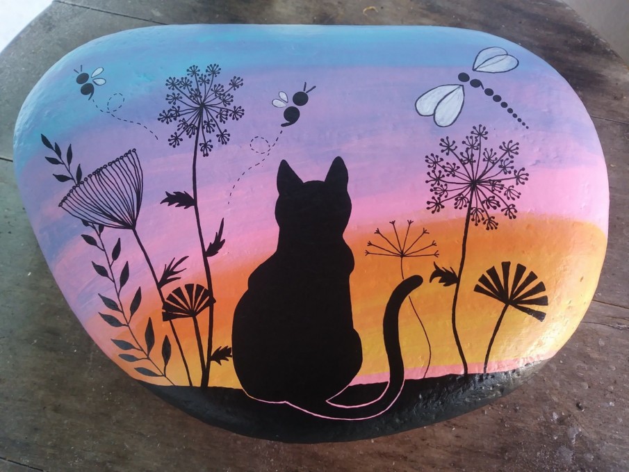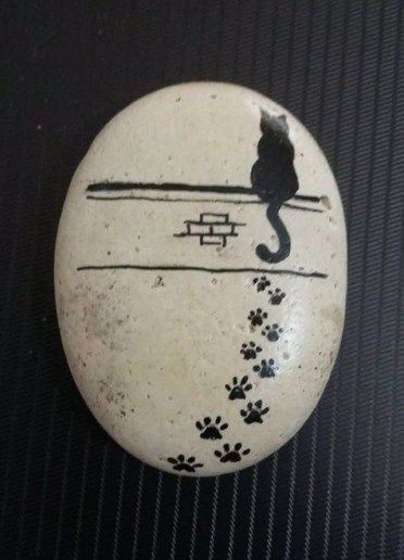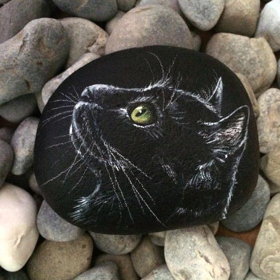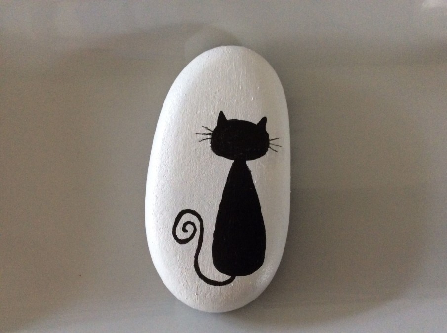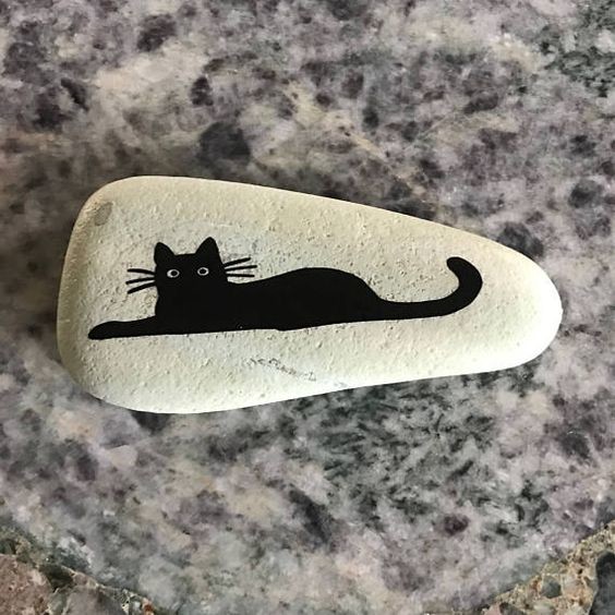 Even if you feel you lack artistic talent, you can easily replicate this simple cat silhouette against a clean white background. To begin, all you need is a rock with a flat surface and some black and white acrylic paint.