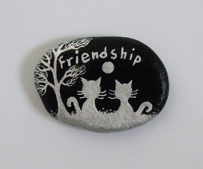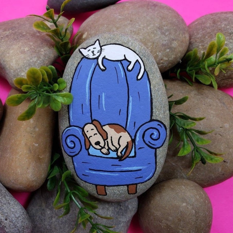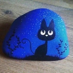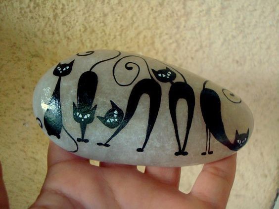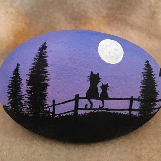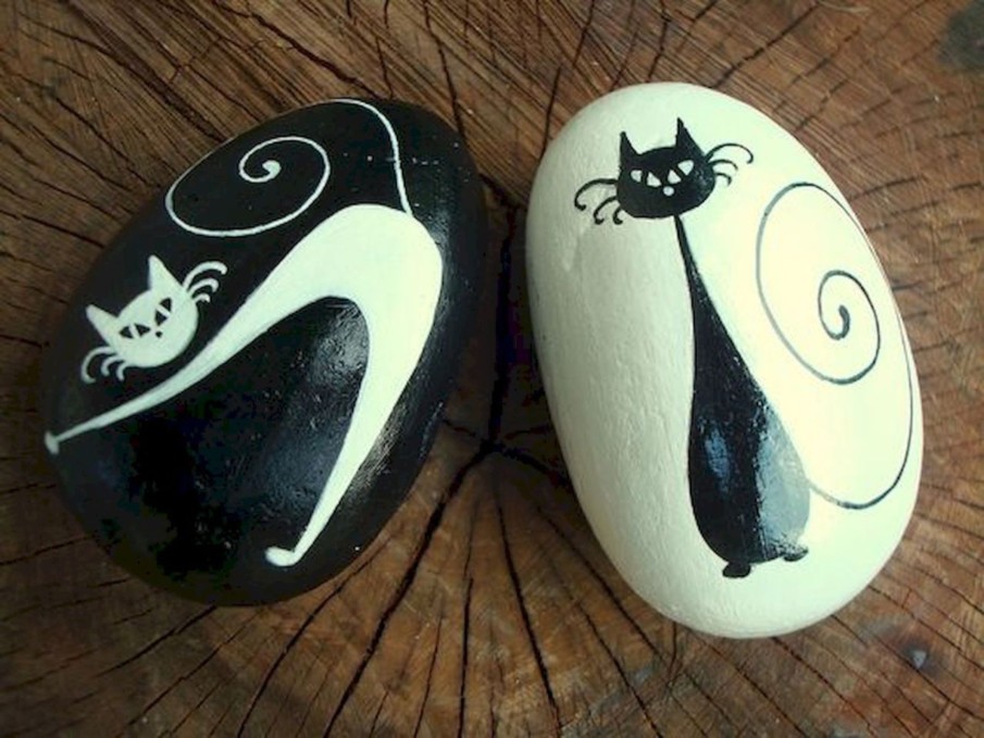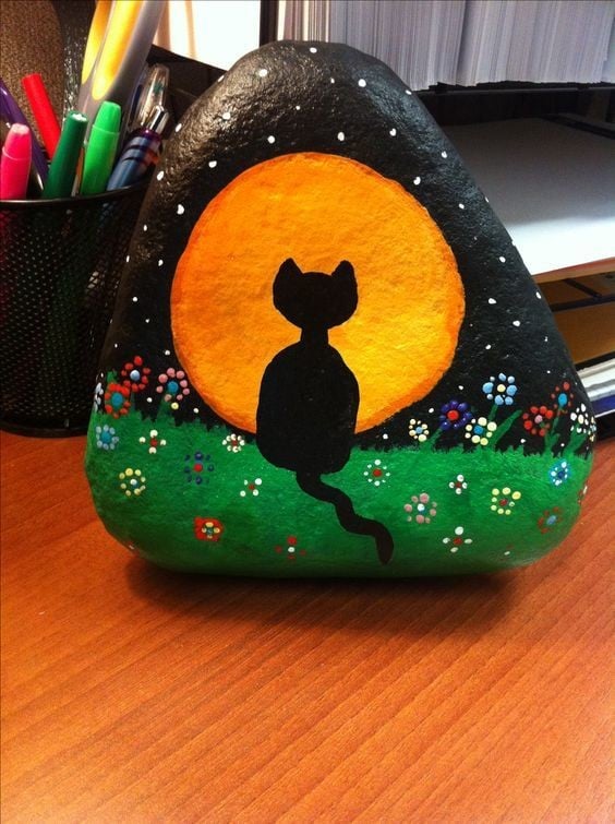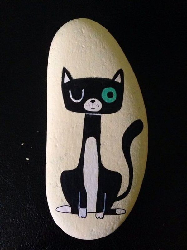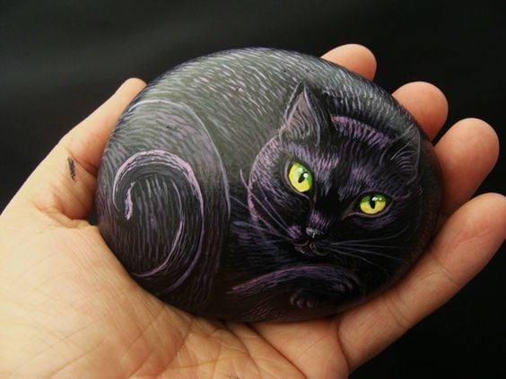 In every classroom, there’s a student who puts in the least effort but still achieves top grades. This cat rock painting idea is perfect for that kind of creative spirit. The unique curves of this cat give it an almost ghost-like appearance.