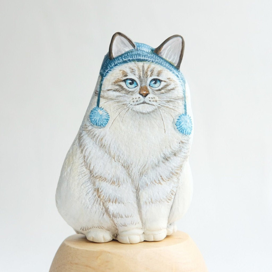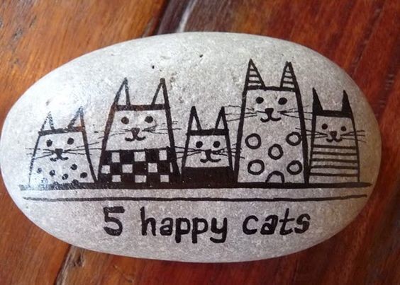 The rock says ‘5 happy cats,’ and the cats certainly look pleased. Their pointy ears and simple yet expressive faces are wonderfully done.