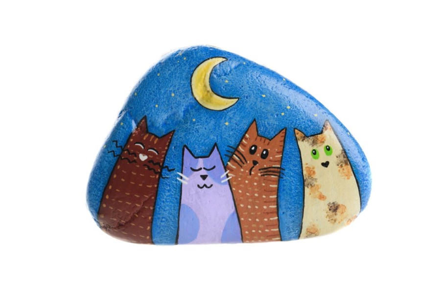 This rock painting is both simple and surprisingly detailed. Each of the four cats displays a unique personality through its expression. From the left, you see the mischievous one, followed by the wise one, the curious one, and finally, the responsible caretaker of the group on the far right.