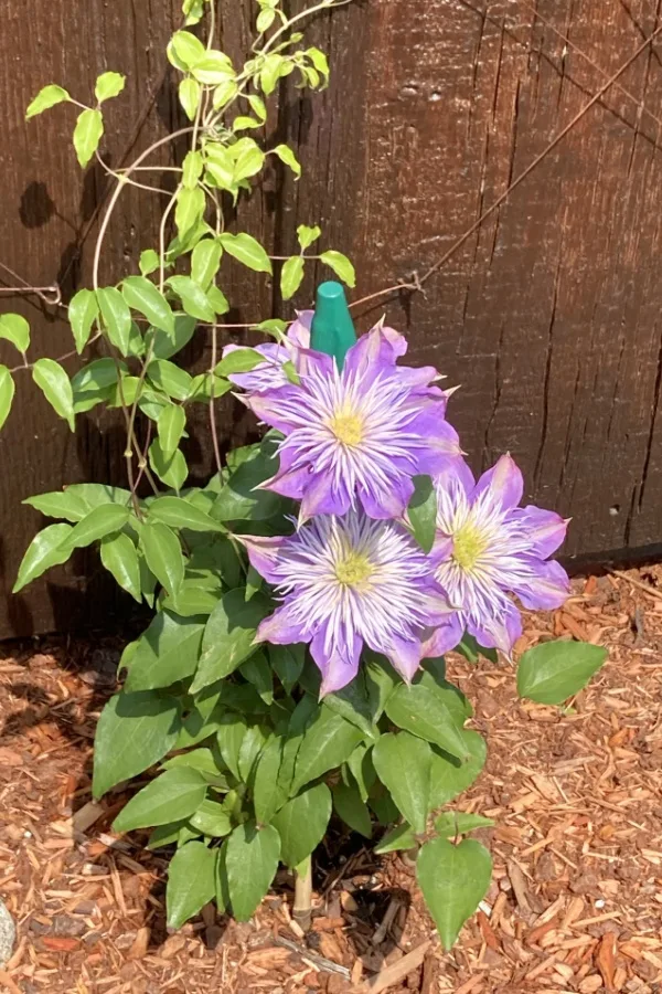 First, clematis plants thrive when their roots are cool and shaded while their leaves and flowers receive full sun. You can help create these ideal conditions by applying a thick 4 to 6-inch layer of mulch around the base of each plant.
