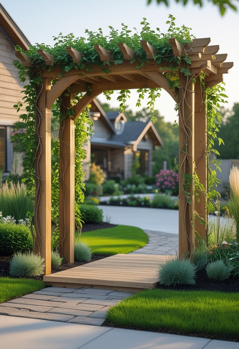 A wooden arbor provides an instant dose of warm, natural style to your front yard. It serves beautifully as an entryway or as a striking feature along a walkway.