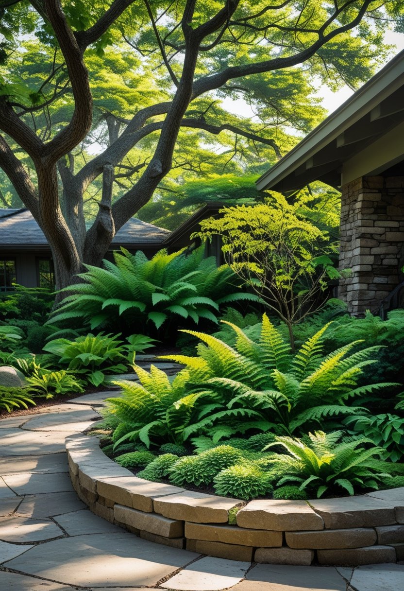 Ferns can add a soft, natural element under the canopy of shade trees. They thrive in low-light conditions, making them an ideal choice for spots where grass struggles to grow.