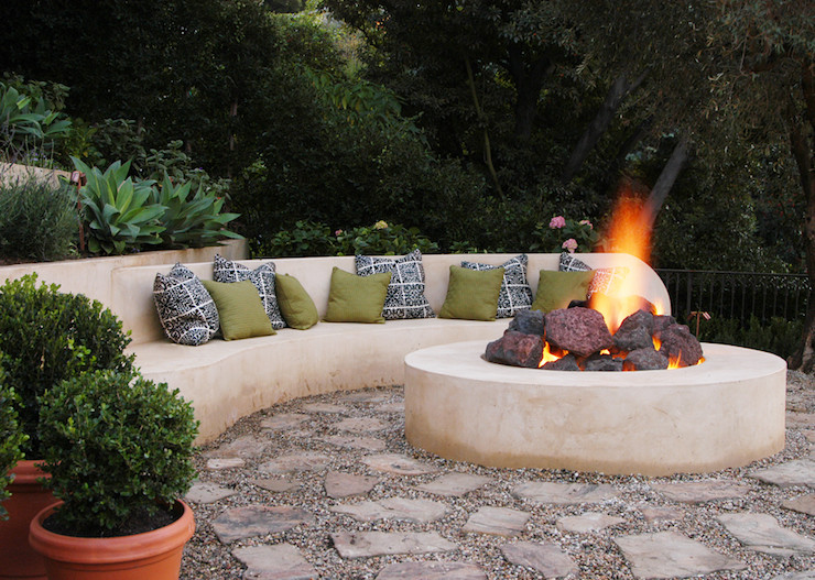 For a rural, desert-like aesthetic, create a round concrete patio with a metal fire pit as the centerpiece. Complete the design with integrated wall seating, and the result is an exotic retreat for you and your family to enjoy together.