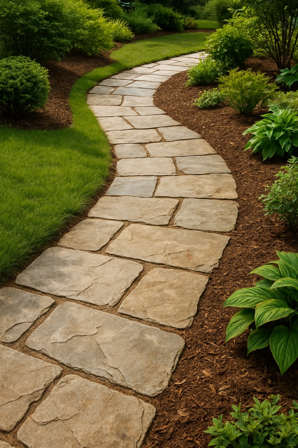 A curved flagstone pathway can bring a relaxed, natural energy to your front yard. The gentle bends make the walk feel more inviting and dynamic than a simple straight line. When you line the edges with mulch, you soften the transition from the hard stone to your surrounding plants. Mulch also has the practical benefit of suppressing weeds and enriching the soil over time. This design pairs beautifully with garden beds, guiding visitors through your landscape in a smooth, friendly way. For a more organic appearance, choose flagstones in various shapes and colors, making sure each one is set firmly to avoid a wobbly path. Remember to refresh the mulch border annually to keep it looking sharp. For a seamless flow, select a mulch color that complements your flagstones and keep it a few inches from the stones to prevent it from shifting onto the path.